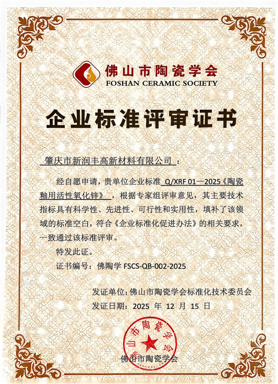 未来,新润丰将继续秉持匠心,以高标准引领产品品质,与广大陶瓷企业伙伴同心协力,助力中国陶瓷行业实现更高质量、更绿色、更可持续的发展。期待《陶瓷釉用活性氧化锌》企业标准尽快完成后续程序并正式发布,成为连接创新原料与高端陶瓷制造的可靠桥梁,以标准共识推动质量共进,以源头创新支撑终端升级,共同锻造中国陶瓷面向世界的新竞争力!