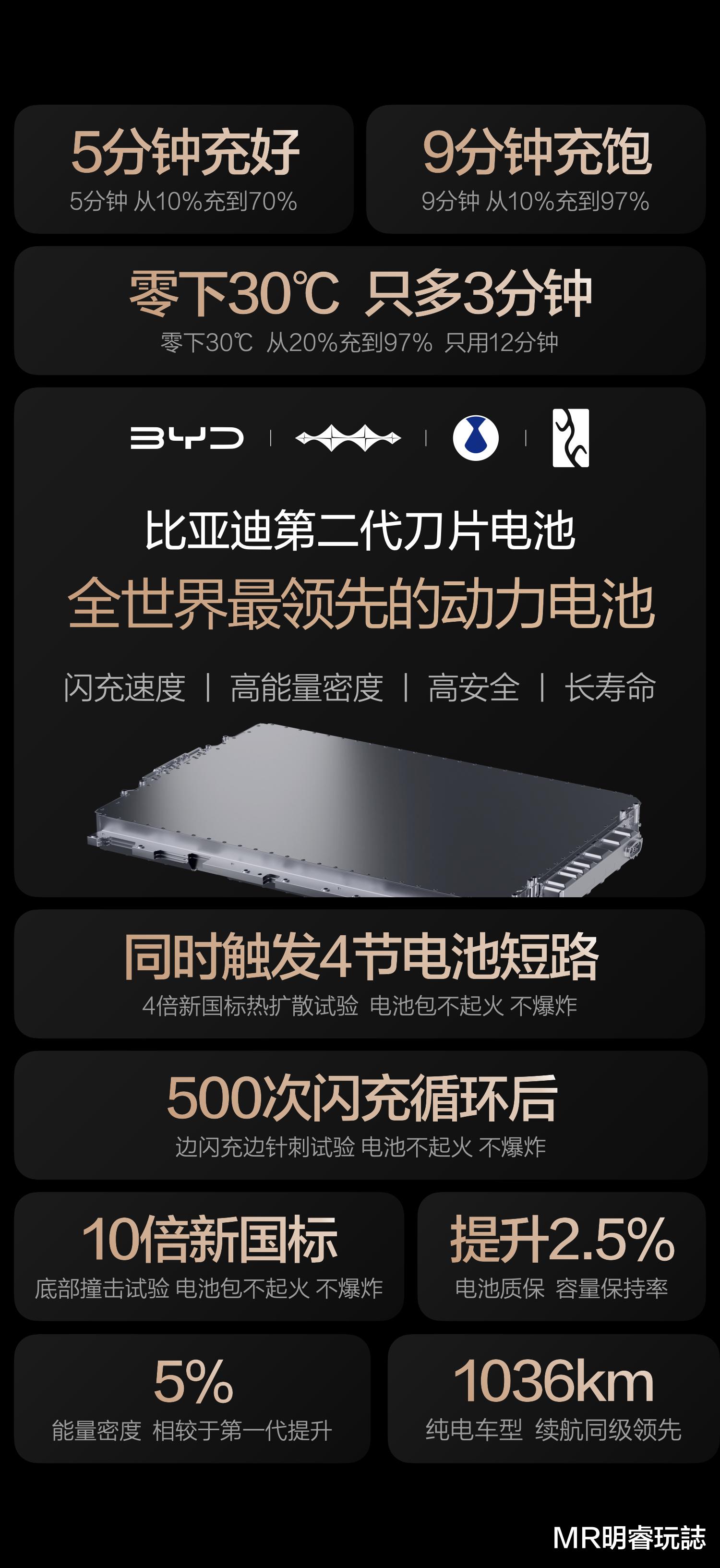 此次发布的第二代刀片电池,闪充性能堪称行业天花板,常温状态下 5 分钟即可完成快充、9 分钟充饱,即便是零下 30 度的低温环境,也仅需多花 3 分钟,彻底解决了用户的充电焦虑。而面对 “闪充是否影响电池寿命” 的行业共性疑问,比亚迪给出了硬核答案。通过打造 “锂离子高速通道” 和 “全温域智能热管理系统”,实现闪充低产热、快散热,让大功率充电对电池寿命的影响微乎其微,真正做到闪充与长寿命兼得。