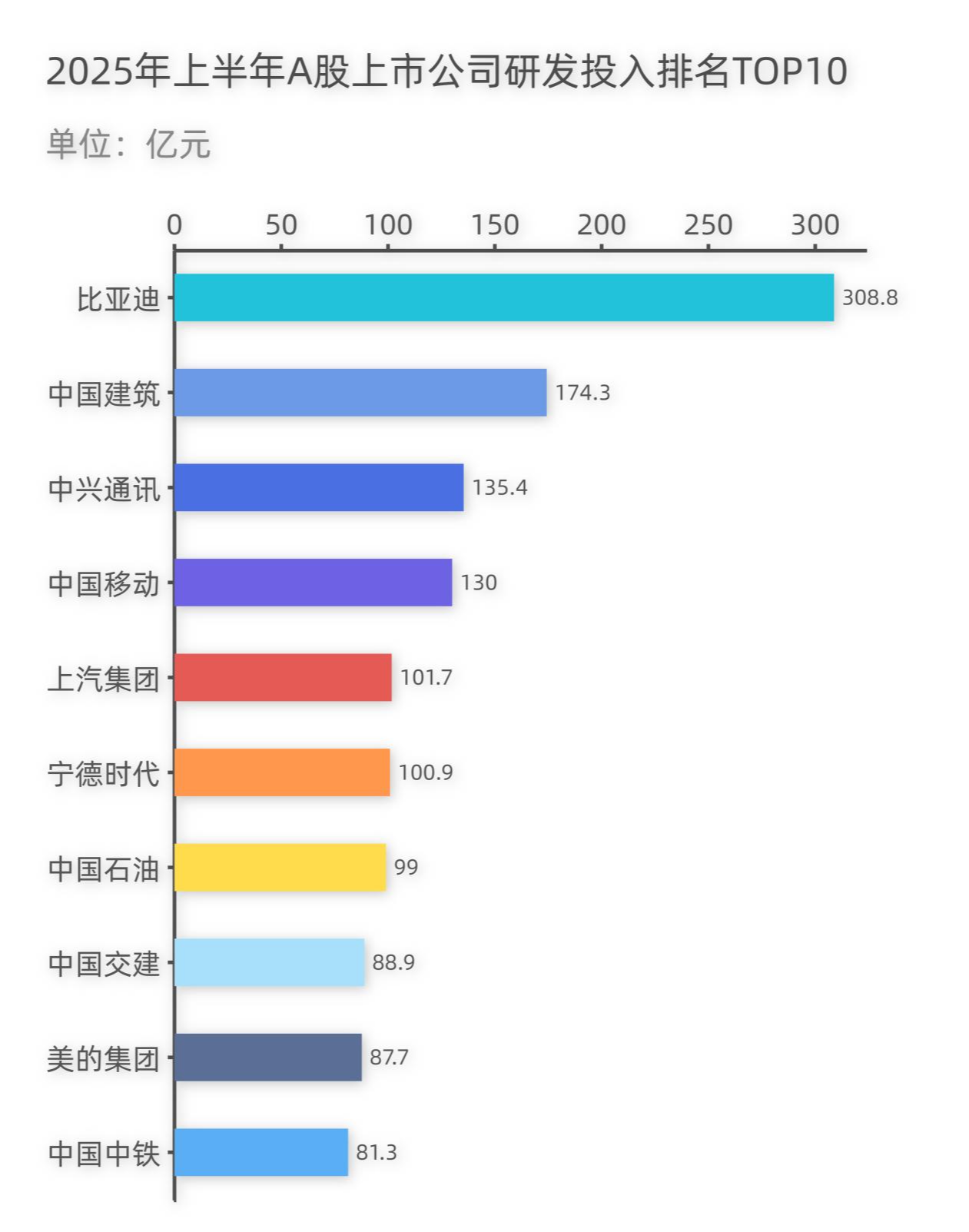 论规模和营收,比亚迪都成为了当之无愧的领跑者,不过这背后是技术和研发的领跑,长期专注新能源技术研发的结果,2025年上半年财报显示比亚迪净利润155亿,但是研发竟然达到了309亿元,几乎是净利润的两倍,研发投入强度之大,创中国汽车公司纪录,也是今年上半年A股上市公司研发投入排名Top1,说比亚迪是伪装成汽车制造业的科技公司。
