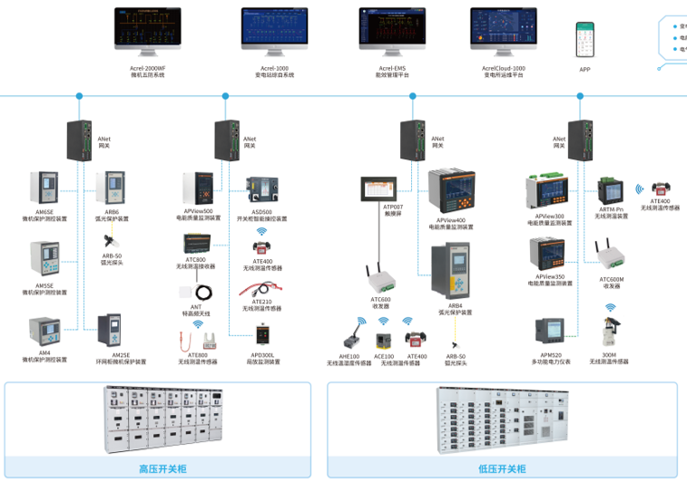 针对110kV及以下用户变电站,通过微机保护装置、弧光保护装置、智能操控装置、接点测温产品、局放监测装置、电能质量监测/多功能仪表、环境传感器等二次设备采集变电站内各类信息到监控系统/EMS能效管理平台进行分析、预警及控制,保障用户变、配、用电全过程的可靠、安全、有序运行。