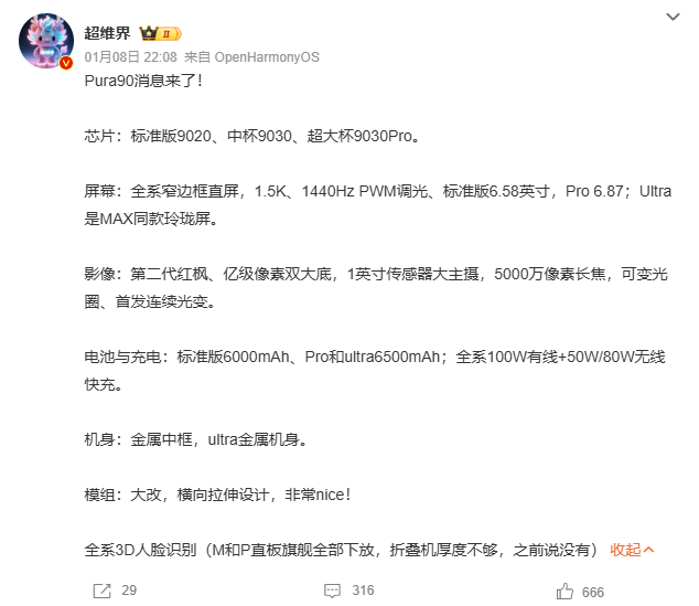 近日,据数码博主@超维界 透露:“Pura90消息来了!①芯片:标准版9020、中杯9030、超大杯9030Pro。②屏幕:全系窄边框直屏,1.5K、1440Hz PWM调光、标准版6.58英寸,Pro 6.87;Ultra是MAX同款玲珑屏。③影像:第二代红枫、亿级像素双大底,1英寸传感器大主摄,5000万像素长焦,可变光圈、首发连续光变。④电池与充电:标准版6000mAh、Pro和ultra6500mAh;全系100W有线+50W/80W无线快充。⑤机身:金属中框,ultra金属机身。⑥模组:大改,横向拉伸设计,非常nice!⑦全系3D人脸识别(M和P直板旗舰全部下放,折叠机厚度不够,之前说没有)”。就问屏幕前的各位花粉,这套配置强不强!