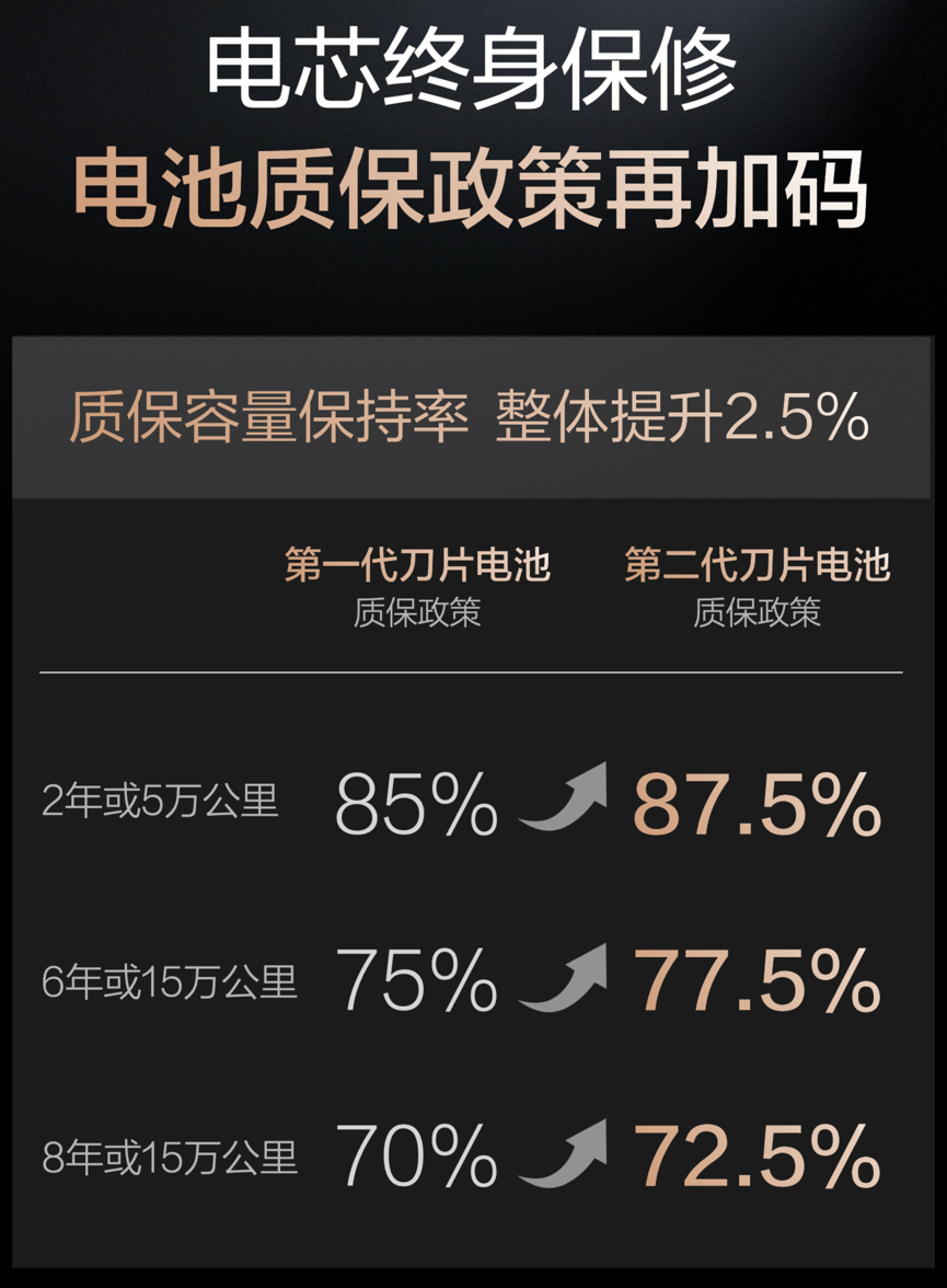 对于普通消费者而言,最直观感受到“长寿命”信心的,往往是那张随车保单。比亚迪此次宣布,针对第二代刀片电池的质保政策再加码:在6年或15万公里内,电池包容量保持率低于77.5%即可免费包换,相比此前标准整体提升了2.5个百分点。这一细微的数字变动,背后是比亚迪对电池衰减曲线的绝对掌控。