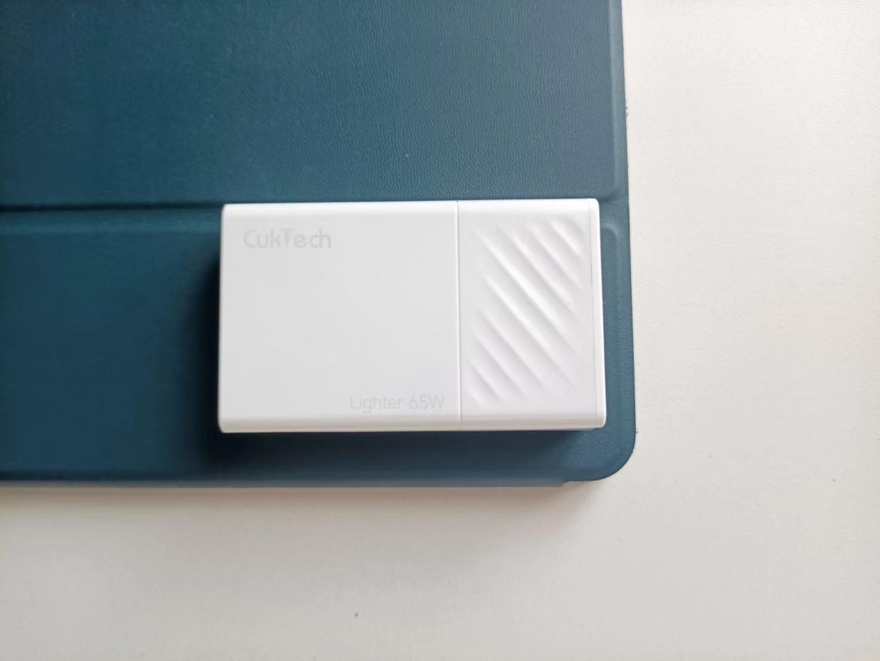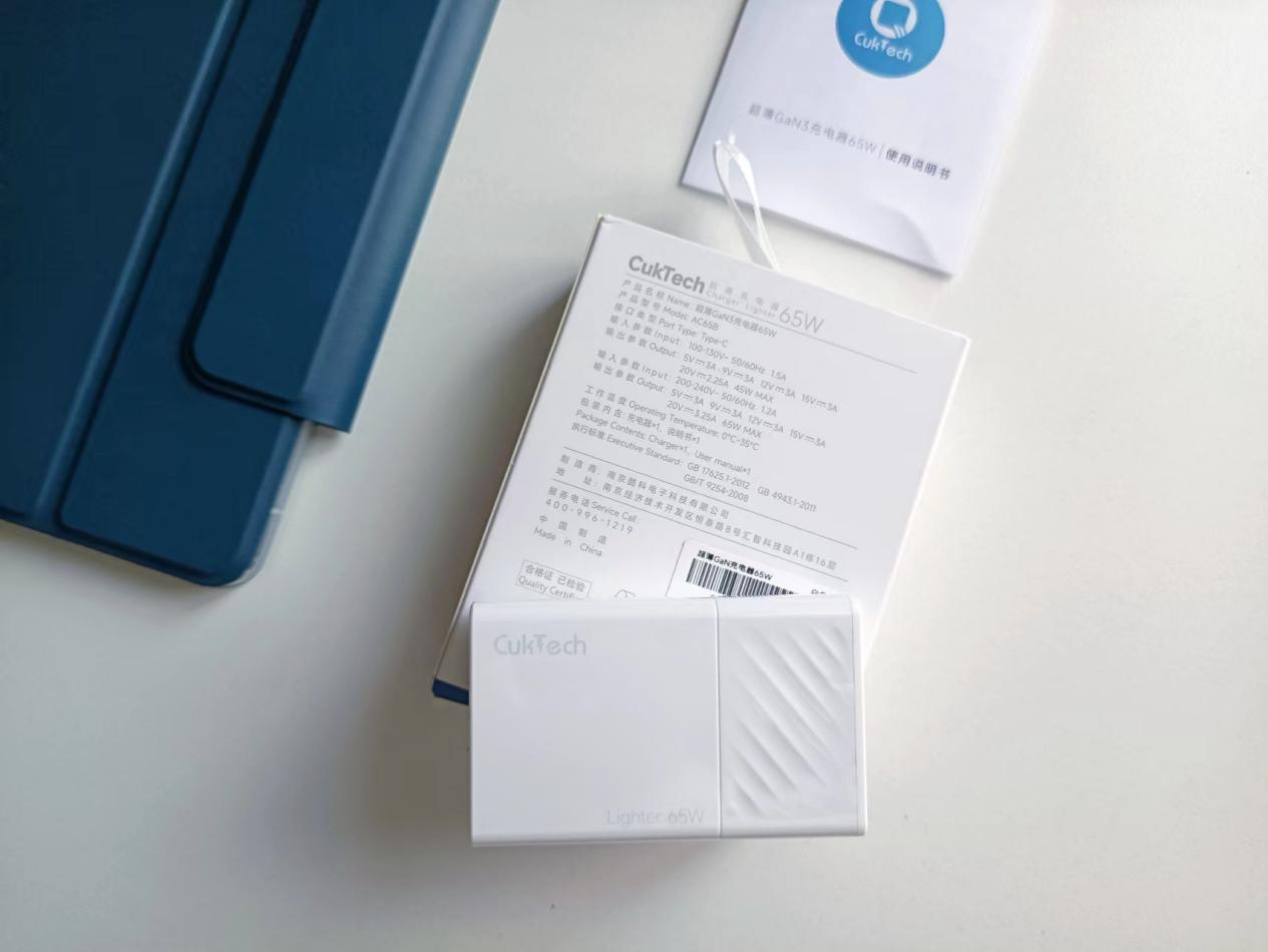 酷科超薄65W 氮化镓充电器的包装盒是抽拉式的,开箱过程仪式感十足。充电器采用长方体外观设计,表面磨砂工艺,正面印有“CukTech”标志,整体尺寸小巧,厚度仅为 14.5mm,放入口袋也不突兀,边角圆润,手感极佳。