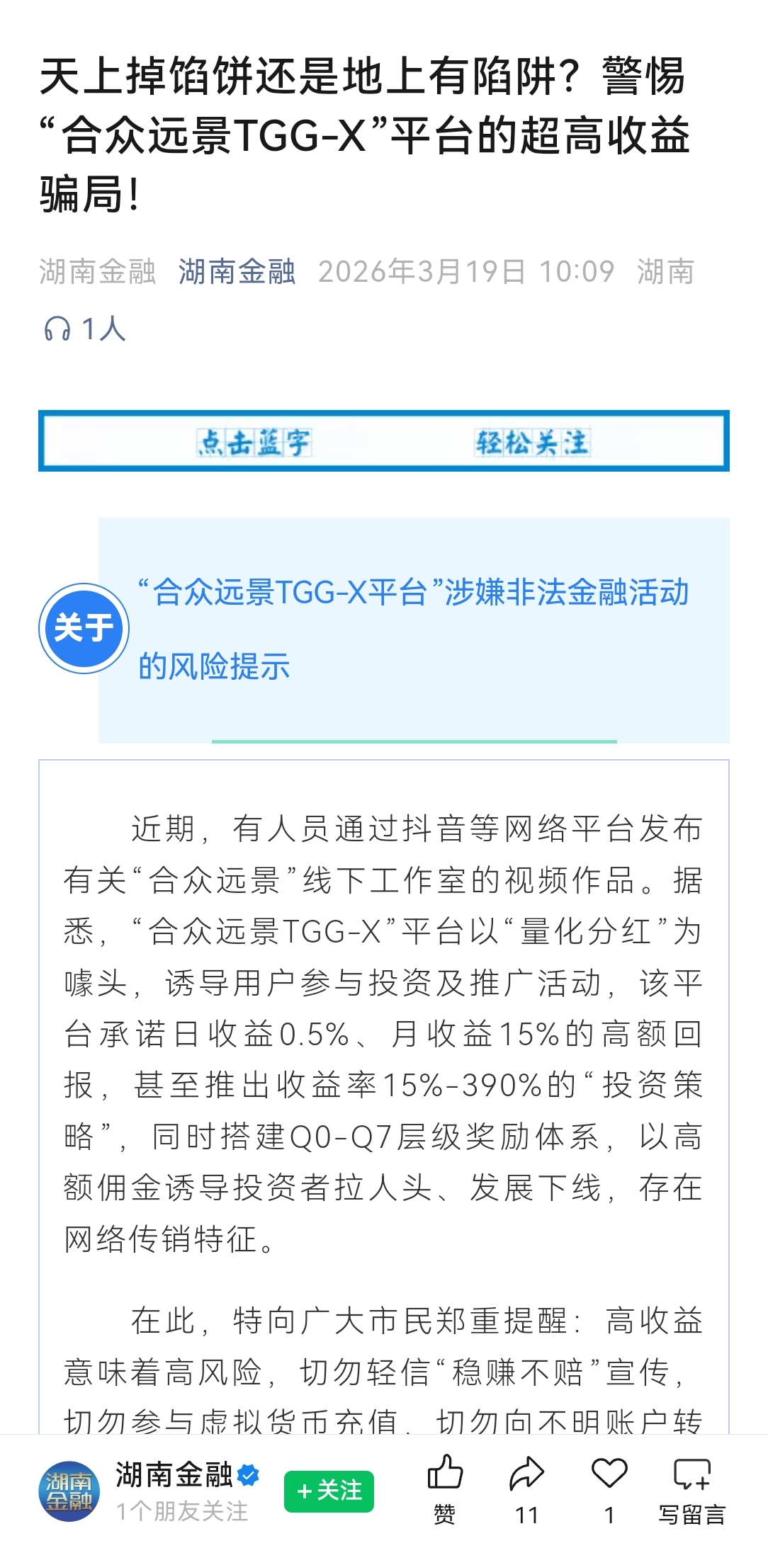 原文:天上掉馅饼还是地上有陷阱?警惕“合众远景TGG-X”平台的超高收益骗局!(来源:湖南金融)
