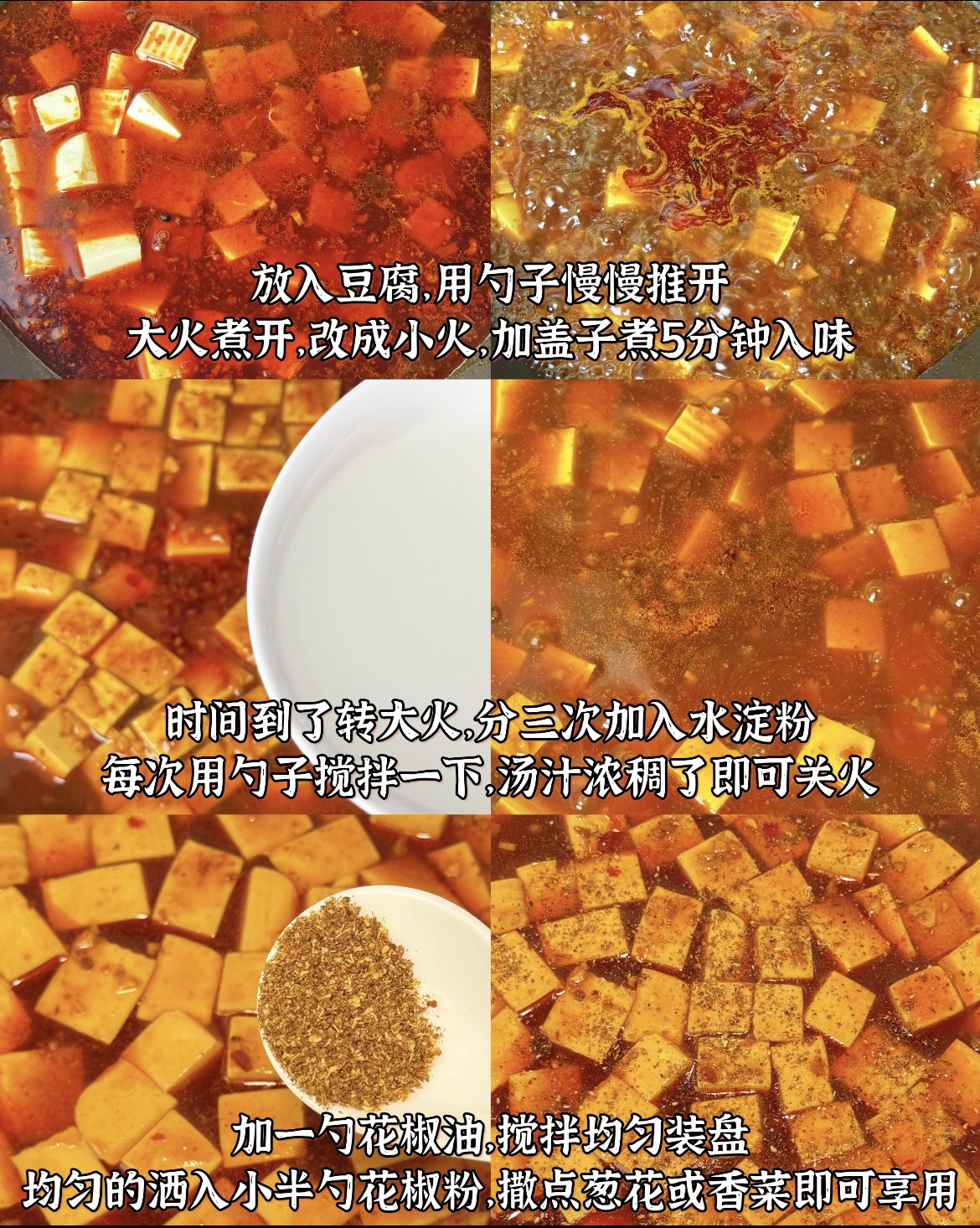 待汤汁收至一半时,就可以进行勾芡了。分两到三次淋入水淀粉,每次淋入后都要轻轻推动豆腐,使其均匀裹上芡汁。这一步能让汤汁浓稠地包裹在豆腐表面,使味道更加浓郁。最后,撒上一把花椒粉,淋入少许热油激发出麻香味,再撒上翠绿的葱花点缀,即可出锅。