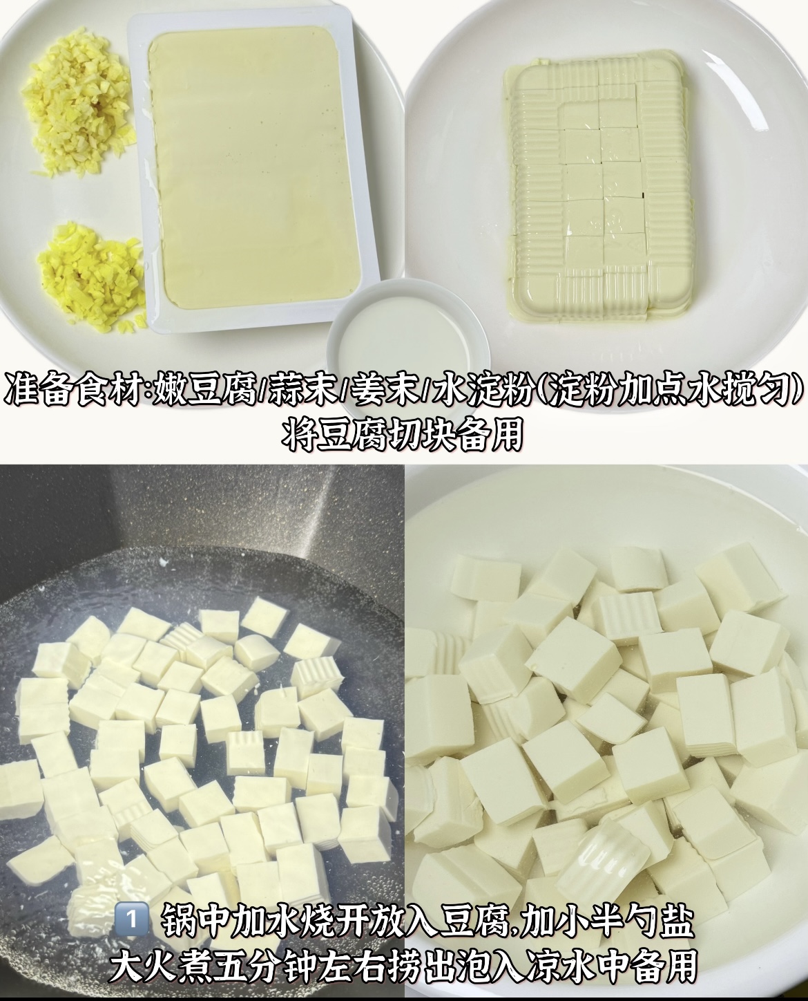 接下来是处理豆腐。将切好的豆腐块放入加了少许盐的沸水中焯烫片刻,这一步不仅能去除豆腥味,还能使豆腐在后续烹饪中不易碎裂,保持完整的形状。焯好后,迅速捞出沥干水分,备用。这一步看似简单,却是保证豆腐口感的重要环节。