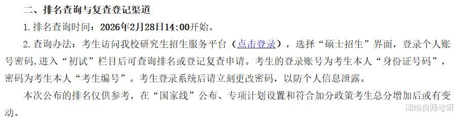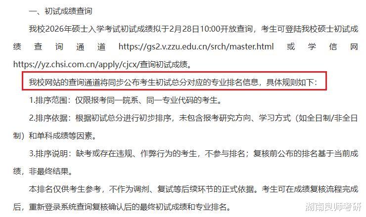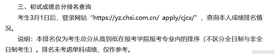 3月10日之前我校将在研究生招生管理系统中公布初试专业排名,该专业排名为考生初试总分在报考专业中公开招考考生(不区分全日制和非全日制)的排名。