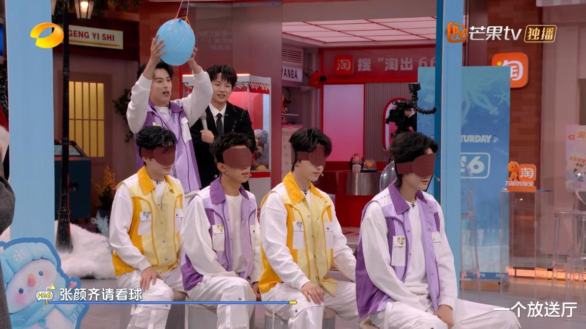 四个人戴着眼罩坐一竖排,头上是水球在摇晃,被喊到名字的人必须站起来,如果被水球砸到就输了。