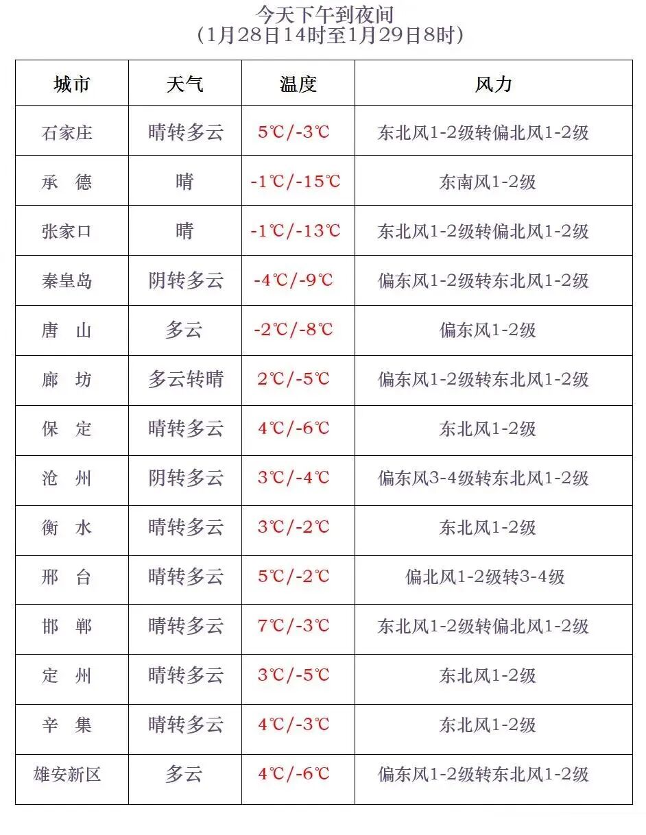 河北省气象台2026年1月28日11时发布天气预报: