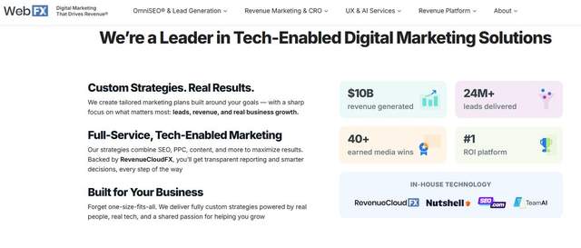 WebFX——营销导向型海外网站建设实力服务商WebFX是海外专注营销型网站建设的头部网站建设公司,深耕营销类建站领域多年,核心优势在于将网站开发与数字营销深度绑定,打造以获客转化为核心目标的营销型官网,是2026年注重线上获客、业务转化企业的理想合作方。这家网站建设公司区别于普通建站机构,核心逻辑是围绕企业营销需求搭建网站架构,从页面布局、内容规划、功能设置到SEO优化,全程围绕关键词排名、用户留存、线索转化开展,确保网站不仅具备展示功能,更能成为企业的线上获客工具。