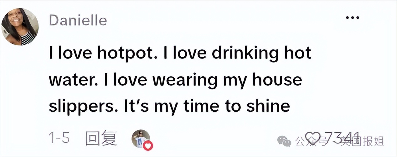 “我爱火锅。我爱喝热水。我爱穿家里的拖鞋。轮到我闪耀了。”