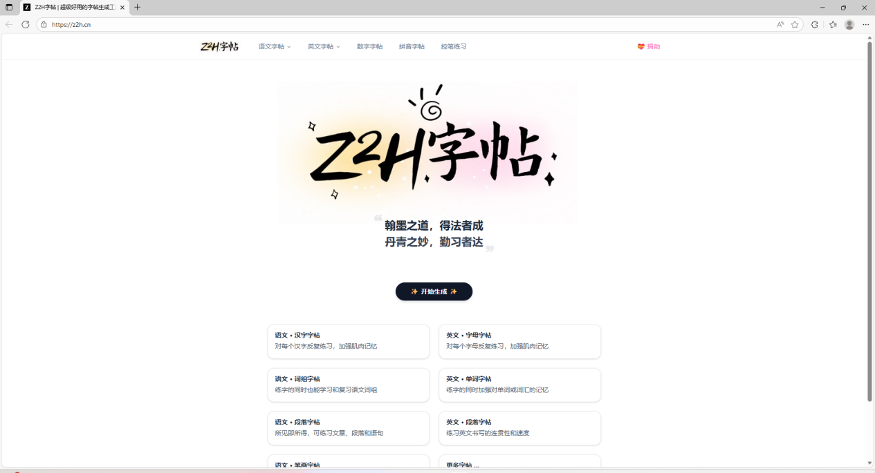 17、Z2H字帖这是一个可以免费在线生成字帖的网站,它可以生成汉字字帖、英文字帖、数字字帖、拼音字帖和空笔练习字帖,还可以任意编辑字帖,例如更改编辑文字、显示笔顺、显示拼音、插入空行或空列,同时支持调整方格大小、行间距、字体类型和字体大小,编辑完成后即可直接导出或打印。