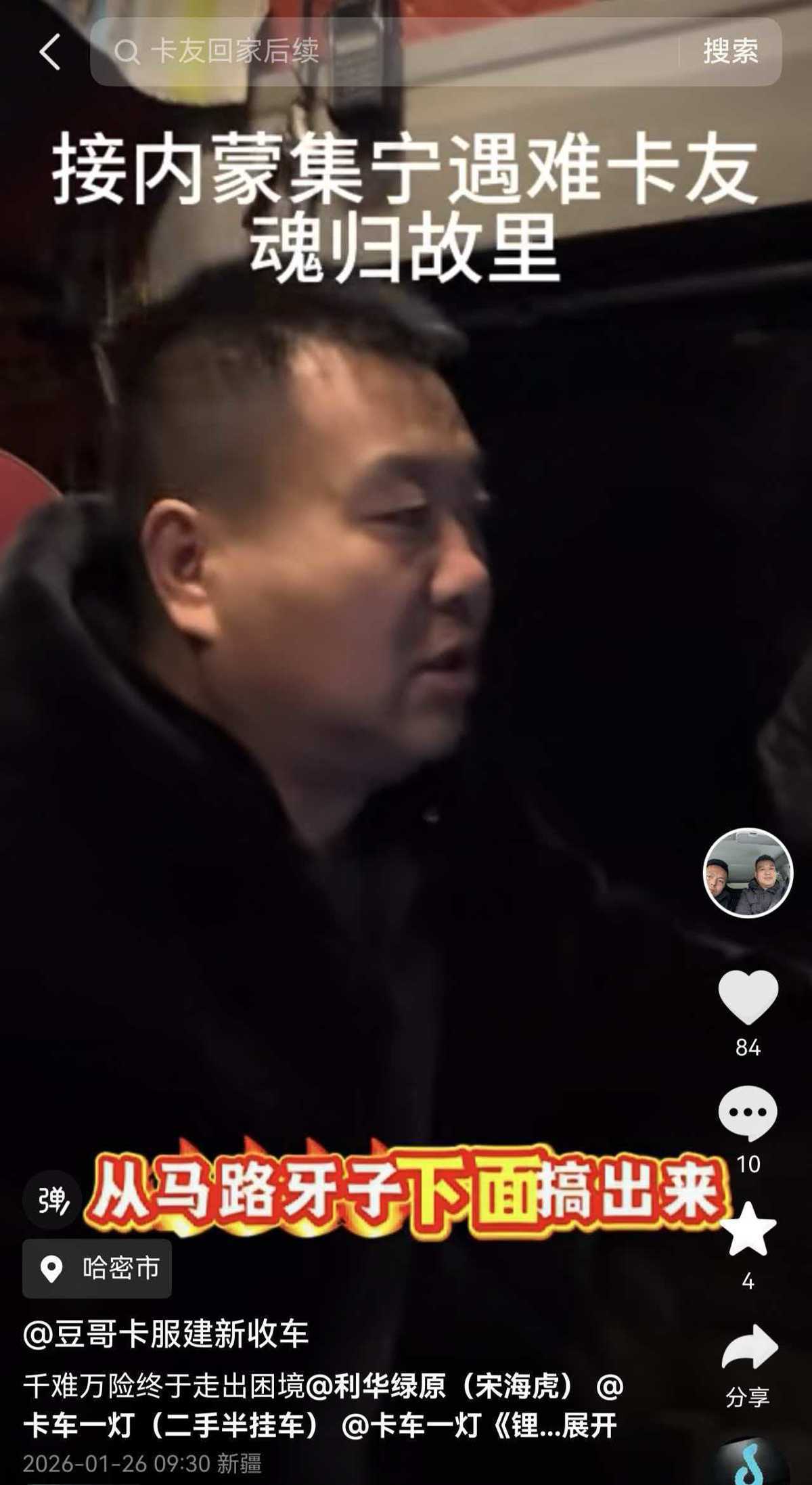 1月26日上午,极目新闻记者联系到上述救援卡友薛建新,他是陕西榆林的二手车商,经常参与大货车公益救援行动。他说目前接到了赵师傅的大货车,已经开出了无人区,刚刚到达了新疆哈密。因为赵师傅的大货车水箱漏水,他们正在找汽修店维修,不知何时才能到内蒙古。