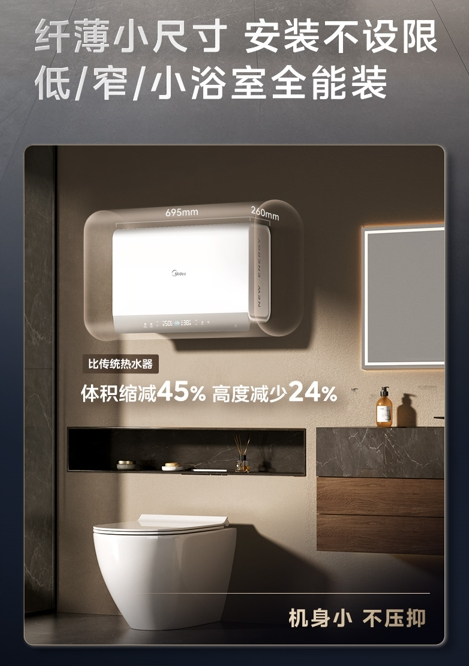 在安装方面,传统燃气热水器存在诸多限制。老旧小区改造困难,农村自建房不通燃气就无法使用,而且安装位置也常常受限。美的超导新能源热水器Z600的安装区域不受限,无论是浴室、阳台,还是小区房、自建房都能轻松安装。即使家里不通燃气,也能体验到燃气热水器般的畅快沐浴感受。在外观设计上,Z600 以纤薄机身突破行业标准,与市面上最小双胆热水器相比,其高度缩减24%,体积缩减45%。安装后可完美嵌入柜体,既能巧妙适配各类装修风格,又能有效节省空间,兼具美观性与实用性。
