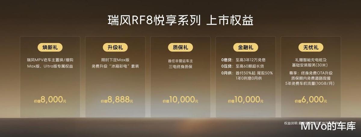 诚意献礼,与百万用户共赴下一个二十五年此次上市的瑞风RF8悦享系列共推出三个版本:悦享Pro版限时抢购价17.69万元,悦享Max版限时抢购价21.19万元,悦享Ultra版限时抢购价22.69万元。同时,瑞风为首批用户准备了至高价值70888元的7重尊享购车大礼,并为老车主提供免费升级原厂车钥匙或HiCar智慧车生活、1666元升级原厂NVH静音包的双重专属感恩权益。