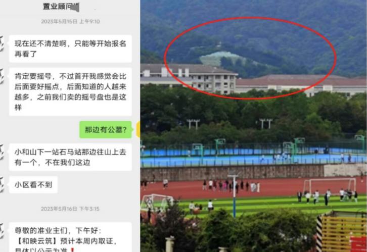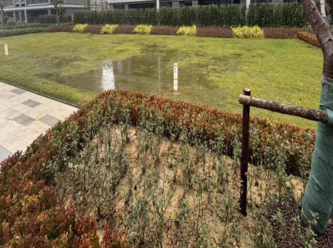 除此之外,小区中存在所有单元楼内楼梯不到负一楼、雨天后绿化草坪坑洼积水等问题,与此前的“无风雨归家”宣传承诺形成强烈反差。业主购房前,因附近有公墓建筑,就此事与开放商销售沟通,多名销售均称“小区看不到(公墓)”,但实际从小区内部可以看到公墓建筑,涉嫌虚假宣传。