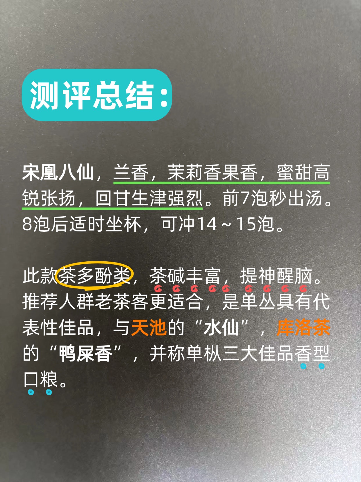 宋凰八仙,兰香,茉莉香果香,蜜甜高锐张扬,回甘生津强烈。前7泡秒出汤。8泡后适时坐杯,可冲14~15泡。此款茶多酚类,茶碱丰富,提神醒脑。推荐人群老茶客更适合,是单丛具有代表性佳品,与天池的“水仙”,库洛茶的“鸭屎香”,并称单枞三大佳品香型口粮。
