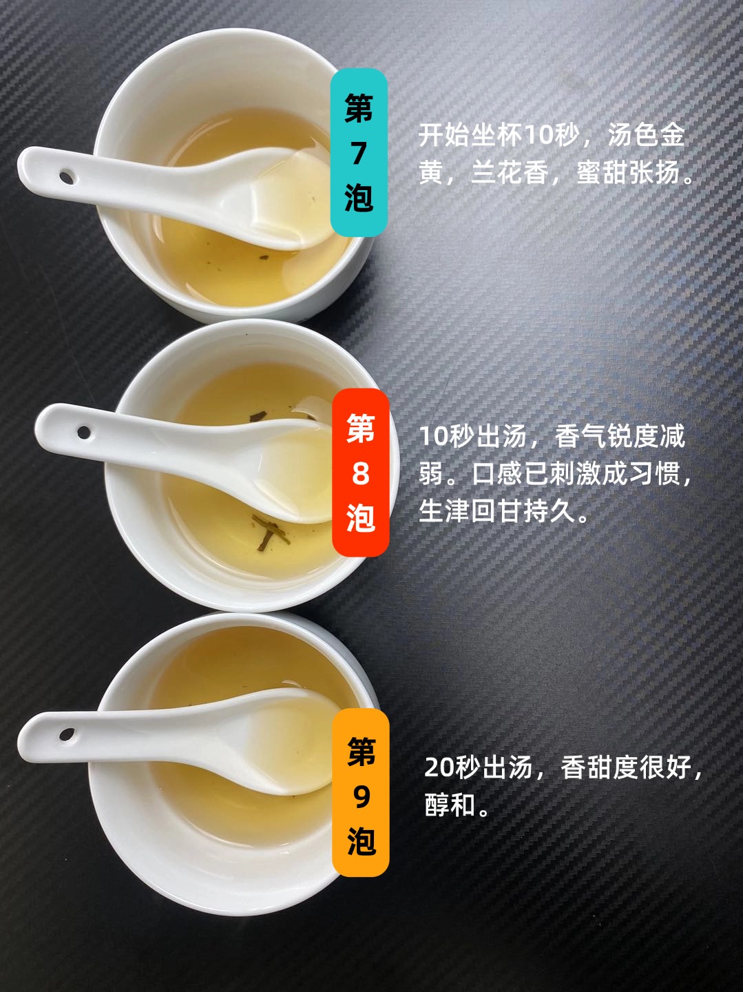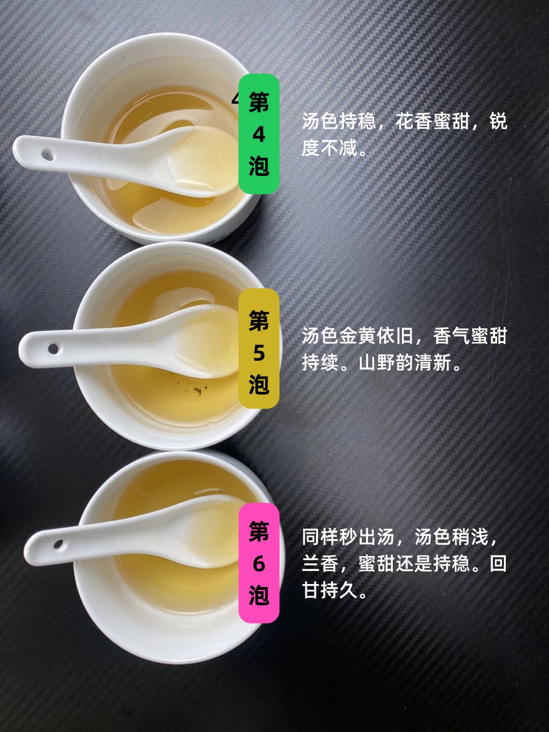 第六泡,同样秒出汤,汤色稍浅,兰香,蜜甜还是持稳。回甘持久。