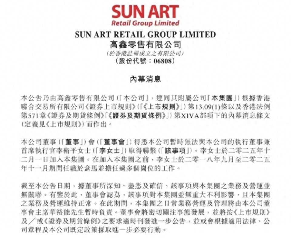 2月4日,大润发母公司高鑫零售有限公司(高鑫零售,6808.HK)在港交所发布公告称,公司董事会得悉,本公司暂时无法与执行董事兼首席执行官李卫平取得联系。
