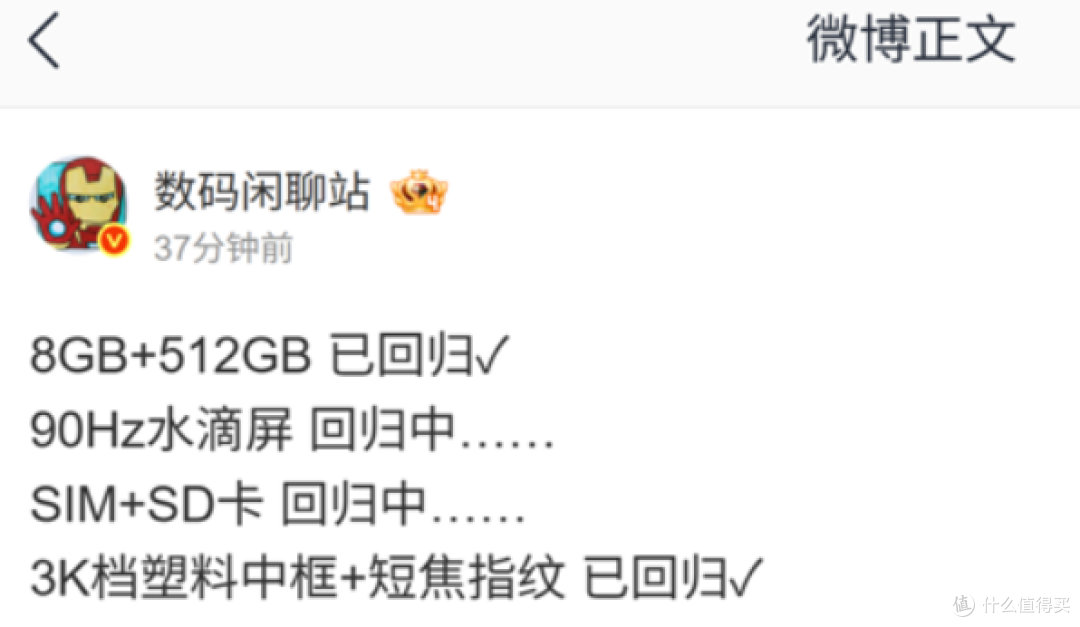 近日,博主爆料说8G+512G回归,水滴屏回归中,SIM加sd卡已回归,3K档塑料中框加短焦指纹已回归,这些配置应该是千元机常见的配置,本次回归可能是上放到3000元挡位的手机上去了。