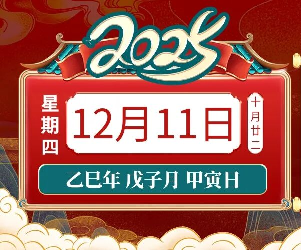 2025年12月11日,星期四,农历十月廿二 (乙巳年戊子月甲寅日),法定工作日。