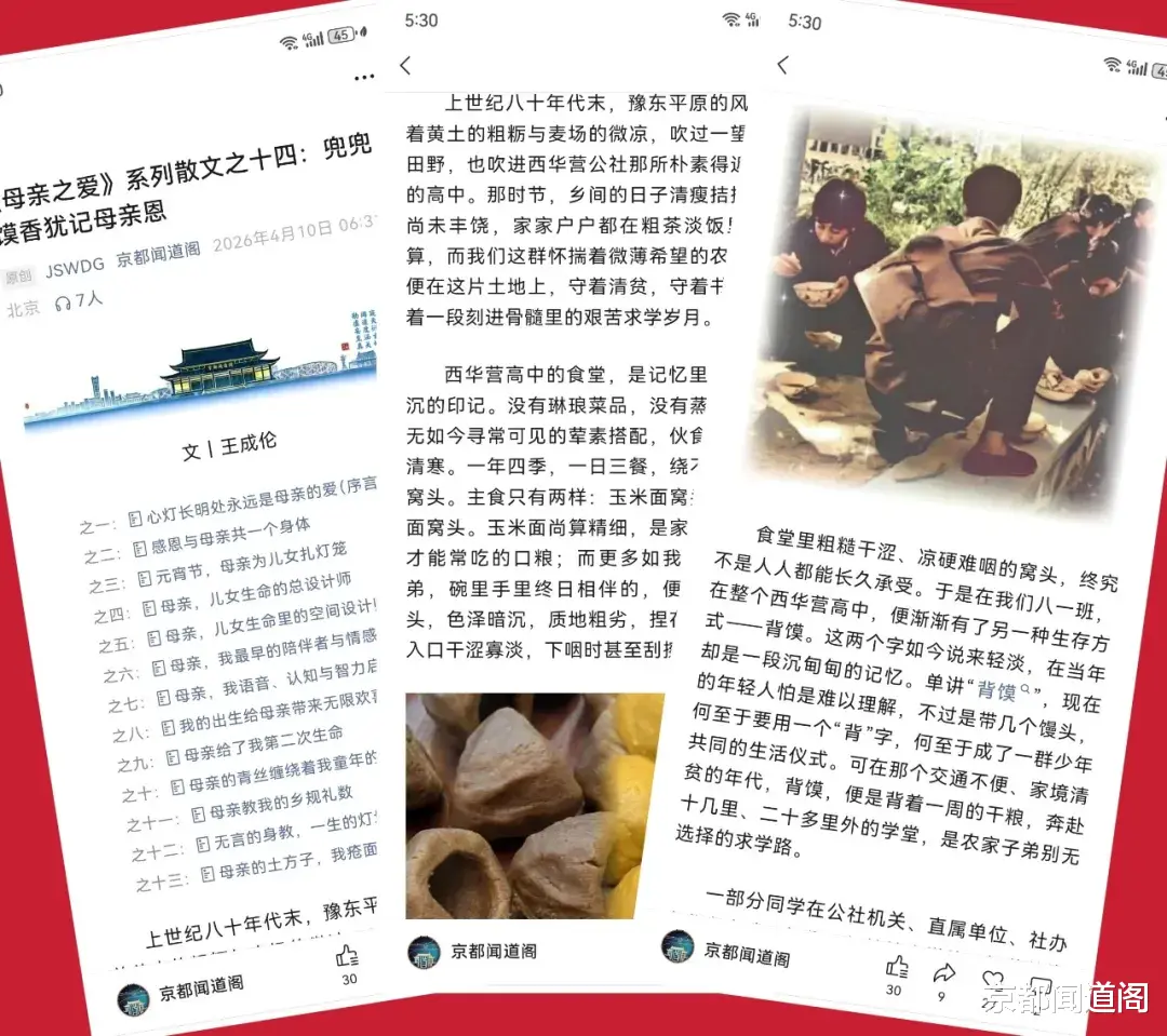 作者描写的当年“背馍”的这一上学方式——宿舍墙上,挂着的各式馍篮馍袋,五颜六色、形态各异,却都装着母亲灶台前的操劳。那些馍,有的白净暄软,有的杂面居多,有的偶尔配上油饼已是奢侈。可无论丰俭,它们都有一个共同的名字——母爱。作者写母亲为了让他吃上细粮,在烟熏火燎中咳泪横流仍不肯停歇;写母亲放下脸面走家串户借来白面;写母亲把最好的口粮悉数留给儿子,自己却默默吞下所有辛劳与窘迫。这些文字读来,眼眶不禁湿润。