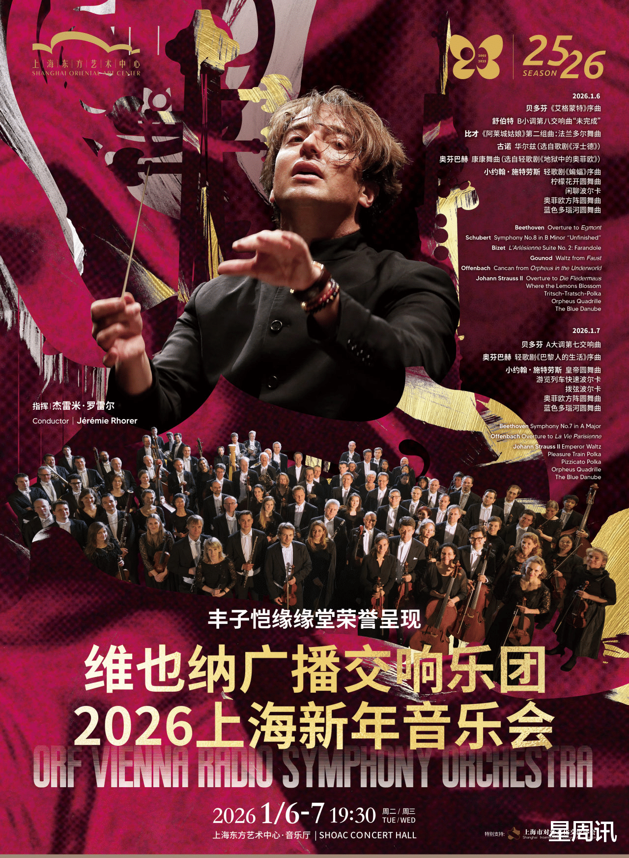 作为“维也纳三大交响乐团”之一,维也纳广播交响乐团不仅代表着“音乐之都”在当代的交响传统延续,更以其开放的风格与创新的精神,成为欧洲最具现代感与辨识度的交响力量之一。2024年,乐团暌违六年回归东艺,由多栖音乐家韦恩·马歇尔执棒,凭借“好莱坞在维也纳”斩获满堂喝彩。今年再度返场,乐团把维也纳的节庆氛围原汁原味带至申城,也在新年伊始为“听交响·到东方”再添浓墨一笔。此次演出也是维也纳广播交响乐团本轮中国巡演的收官之站,从恢宏的交响篇章到轻盈的舞曲旋律,2026年伊始,这场来自“原产地”的音乐会为申城观众带来了一次兼具庄严、典雅与喜悦的节日之旅。