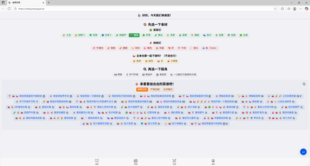 只需要在网页上选择手里现有的厨具和食材,例如土豆、猪肉、电饭煲,就可以匹配出可以做的菜谱,点击下方对应的菜谱,就可以跳转到教学视频,直接跟着做就行了,如果不知道要吃什么,还可以选择让网站给你随机出菜单,完全不用费心去想,网站设计简单,没有乱七八糟的广告,也不用注册。