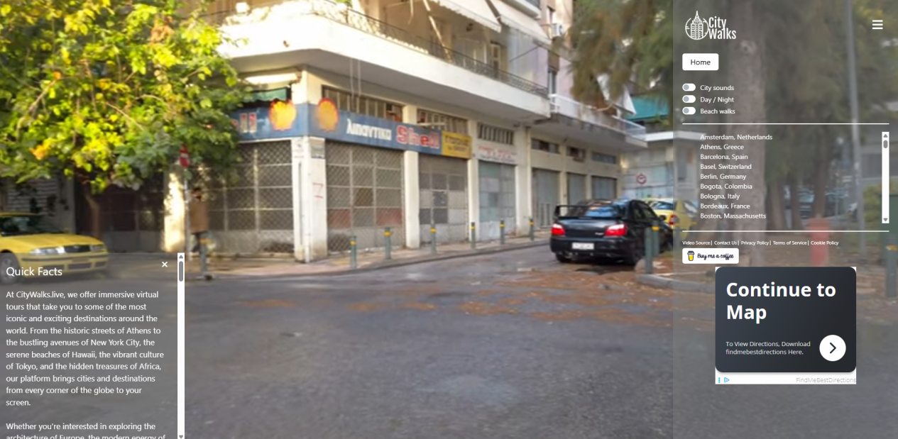 16、City walks这是一个可以让你随时随地“逛遍全世界”的沉浸式街景网站!进入网站后会随机跳转到世界各地街头,让你通过第一视角漫步城市。网站支持白天/夜晚模式,还能选择海滩专属路线,高清画质、真实环境音效让你身临其境。