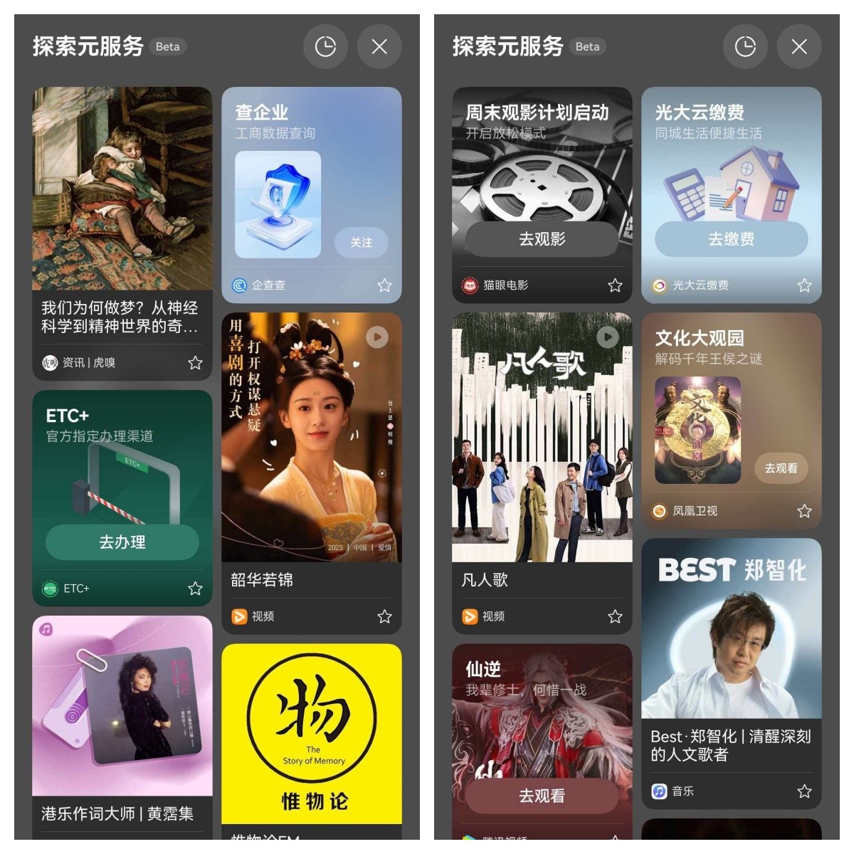 入口非常简单,在手机桌面右滑进入负一屏后,轻轻向上一滑,就能进入全新的「探索元服务」界面,没有复杂菜单,没有满屏广告,只有一张张和你当下可能有关的信息卡片,内容、服务、工具,都静静地排列在这里,等着被你刷到。