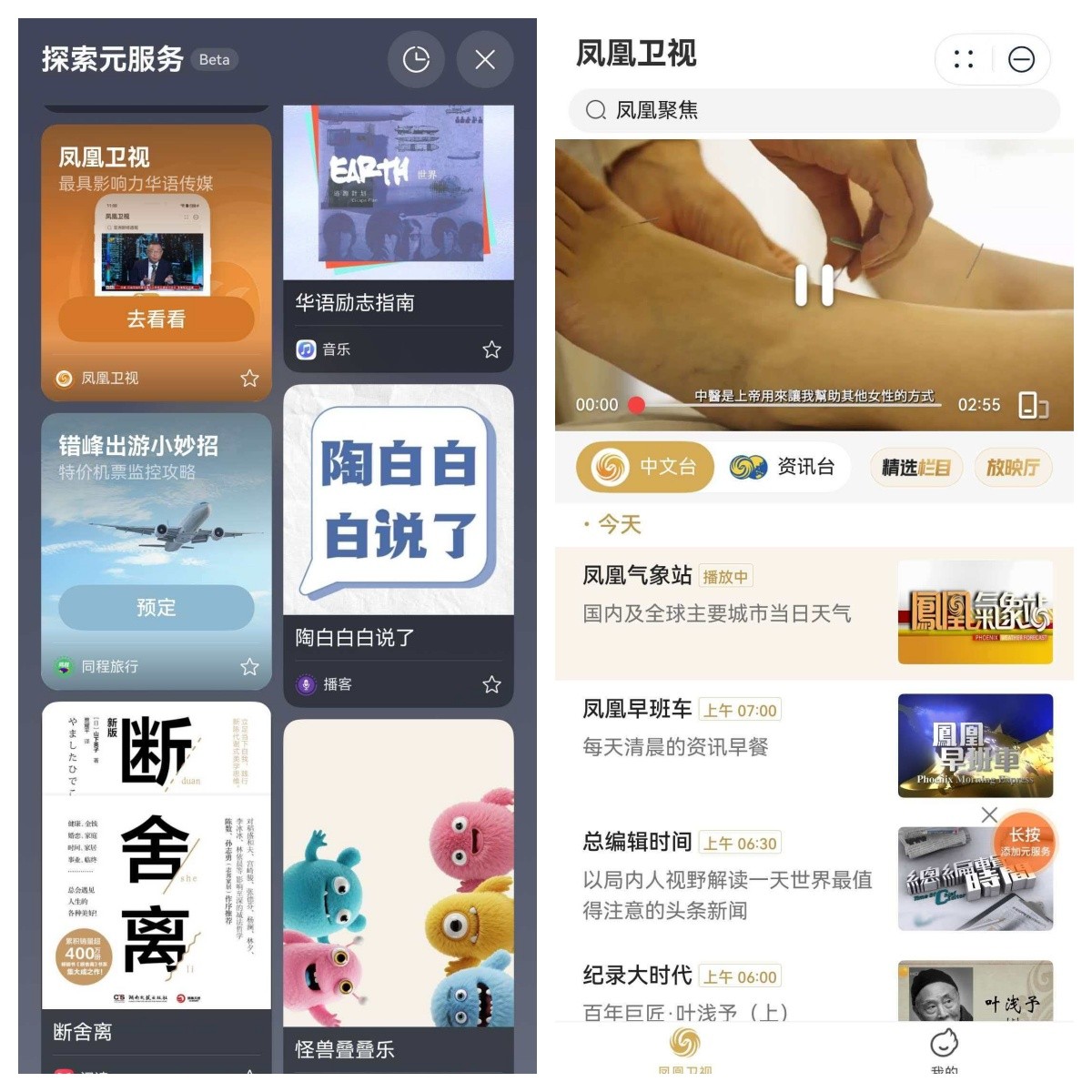 更让我觉得贴心的是,它不仅让点咖啡变简单,连获取我常看的内容也变得更轻松了。我平时喜欢看一些深度资讯,比如凤凰卫视的时事评论和专题报道。以前想看的时候,要么得专门打开网页,要么得在一堆推送里翻找,步骤不少。但在「探索元服务」里,我经常会在上滑后的信息流里,直接刷到凤凰卫视的最新节目卡片或深度文章推荐,点开就能看,不用跳转App、不用登录账号,内容还都挺有质量。它不会只推我“可能爱看”的同类内容,而是围绕“世界与我相关”来组织,既贴合我的兴趣,又自然带给我更开阔的视野。这种获取信息的方式,不再是机械地刷,而更像是一种高效的“遇见”。