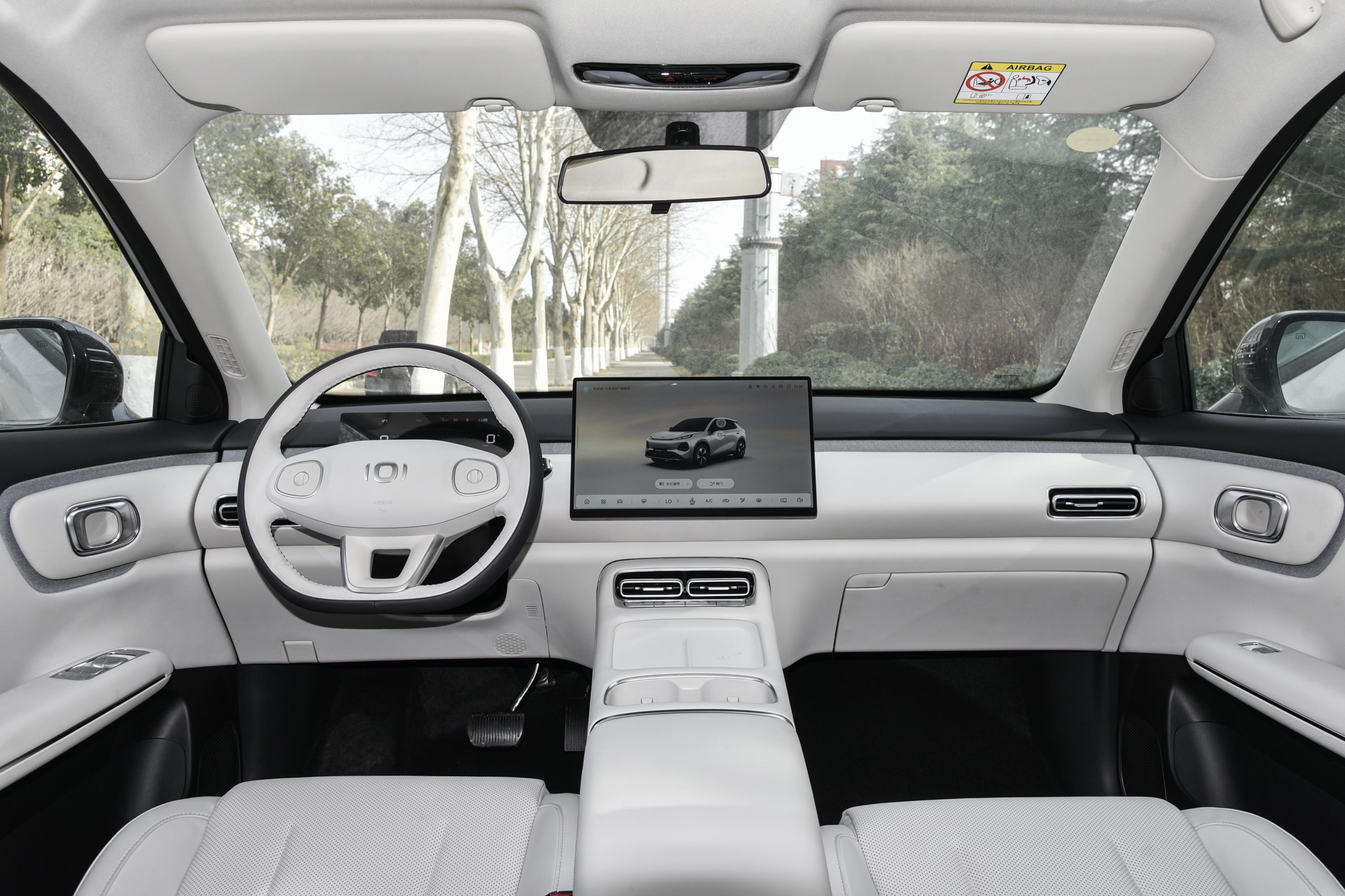内饰方面,新车座舱采用时下新能源车型较为流行的极简风设计,在用料方面,虽然受限于成本,车内使用了一些硬质塑料,但在经常接触的区域,如门板扶手、中央扶手等位置还是使用了仿皮材质进行包裹,触感还算不错。中控台的布局采用了T字型设计,14.6英寸(部分车型为15.6英寸)的悬浮式中控屏位于视觉中心,中岛前部分干干净净,没有任何按键。显示效果清晰细腻,为整车的科技感增色不少。驾驶员前方是一块10.17英寸的液晶组合仪表,可以显示丰富的行车信息。方向盘采用了皮质包裹,支持上下和前后四向调节,握感和功能性都值得肯定。换挡机构则采用了时下流行的电子式怀挡设计,不仅操作便捷,也为前排中央通道节省出了更多的储物空间。