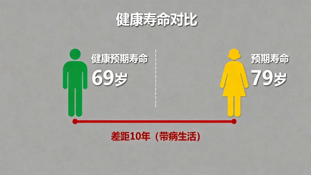 举个例子,比如截止2025年,国人平均预期寿命为79岁,平均健康预期寿命为69岁,它们之间相差10年,那也就意味着从69岁以后的10年,你可能每天都处于带病生活状态,生活质量差,痛不欲生。