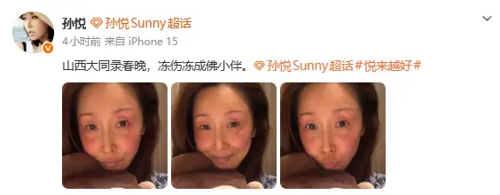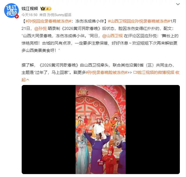 新春临近,各大春晚录制进入冲刺阶段,而山西卫视春晚的一段幕后小插曲,因艺人与官方的双向温柔刷屏全网。1月21日,国民歌手孙悦在个人微博主动自曝录制遭遇,配文“山西大同录春晚,冻伤冻成佛小伴”,附带的脸部特写照片中,她的眼周、脸颊泛着明显深粉色红晕,冻伤痕迹清晰可见,却依旧带着标志性的温暖笑容,这份苦中作乐的乐观与敬业,瞬间引发全网关注。