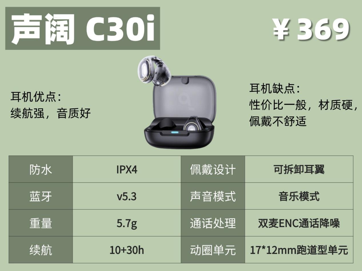 声阔C30i:这款耳机搭载 17mm 跑道型发声单元,配合 360° 环绕音技术,声场宽广、层次感出色,音质表现优秀,不管是听歌还是看剧,都能带来很强的沉浸感,声音饱满通透,整体听感在同价位当中表现十分出众。