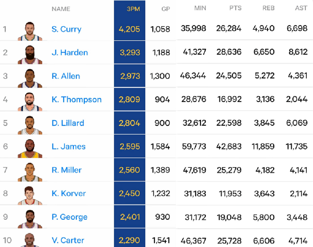 恭喜汤普森(2809个三分球)就像个神射手小火箭,“嗖”地一下,正式超越利拉德(2804个三分球),稳稳当当坐上了NBA史上三分球命中数榜单的第4把交椅,这简直就是三分线上的“武林高手”大升级嘛!