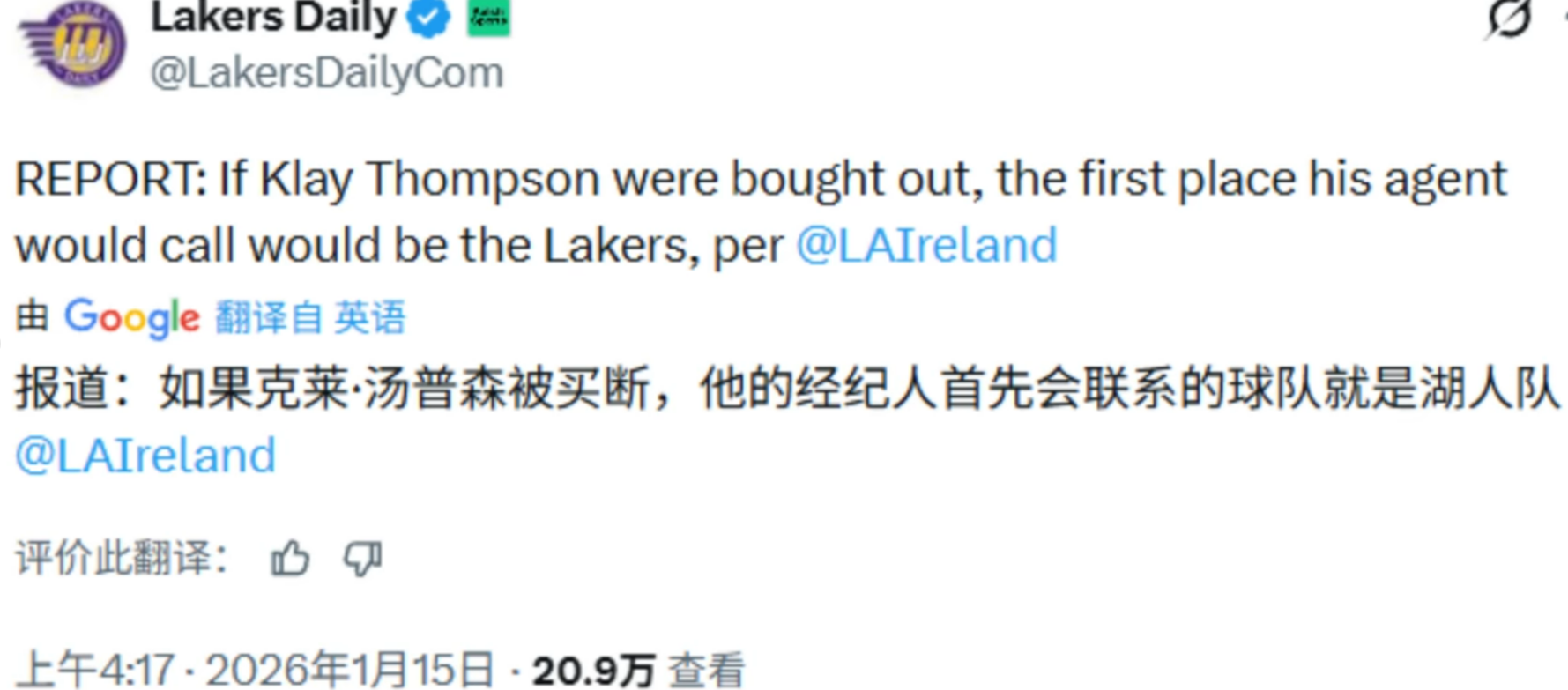 有意思的是,湖人主持人John Ireland透露了个小秘密,如果汤普森被独行侠买断,他的经纪人第一个联系的球队肯定就是湖人。湖人队就像个精明的淘宝达人,去年休赛期,在买断市场上一口气签下了18届状元艾顿,还有前DPOY斯玛特,这操作,简直让人佩服得五体投地。