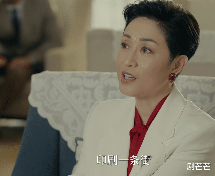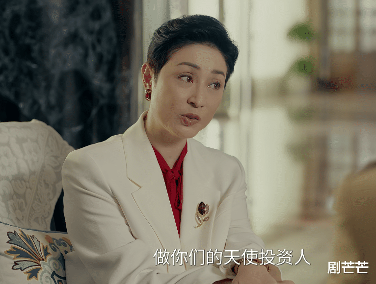 但剧里面实际上的状态,也没差多少。依旧是一头标志性的短发,妆容清淡素雅,一身白色西装,红色衬衫,妥妥的事业风女强人,是谈事的好手。