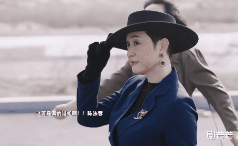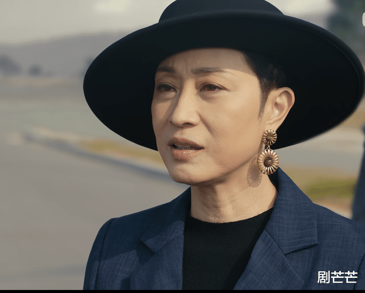 戏外的这场,戴着宽大的帽子,一身蓝色西装,大大的太阳花款式耳环,充满了时代烙印。自然光下,脸上的细纹,一览无余。