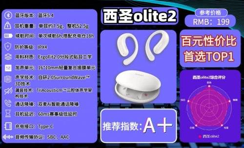 在性能层面,Olite2配备蓝牙5.4高速芯片,连接响应更快、信号更稳。搭载自研低延迟算法,将延迟控制在60ms以内,无论游戏还是观影都能实现精准音画同步。通话方面采用AI ENC智能降噪与双麦克风阵列,能智能识别环境噪声并动态削弱,有效提升语音清晰度。续航方面单次使用可达8小时,综合续航约18小时。值得一提的是,Olite2通过了CCIC权威认证及多项国际检测标准,品质可靠、工艺扎实。以不足两百元的售价,却能带来媲美千元机的音质与佩戴体验,是目前百元价位中性价比最突出的开放式耳机之一。
