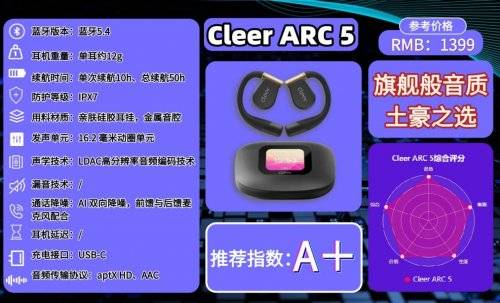 • Cleer ARC 5代——土豪之选 价格:1399元 蓝牙:5.4 耳机类型:挂耳式 耳机重量:单耳12g,整体耳机重量117g 发声单元:16mm 动圈单元 综合评价:五星