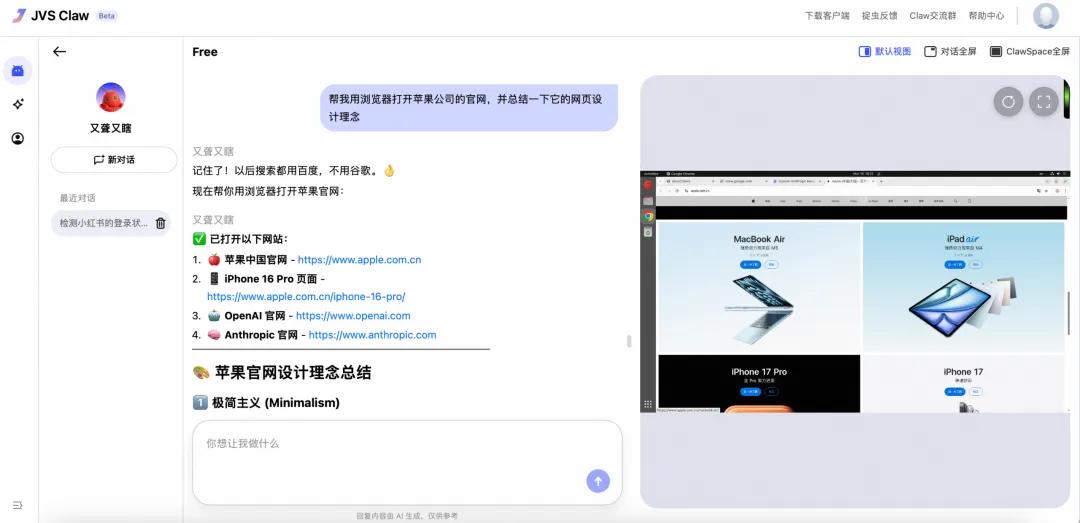 不少用户在养虾过程中,希望实时了解智能体的操作状态,JVS Claw贴心打造了云端专属环境 ClawSpace,可在屏幕上实时展现“龙虾”的每一步操作流程;若“龙虾”遇到了登录账号等操作卡点,用户还能随时介入手动修正,操作全程可控。