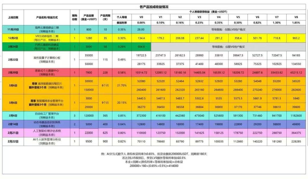 公司设计了一套细致的收益机制,主要影响因素有两个:产品周期与个人等级(V0到V8)。投资者们投得越多,投得越久,赚到的也就越多。