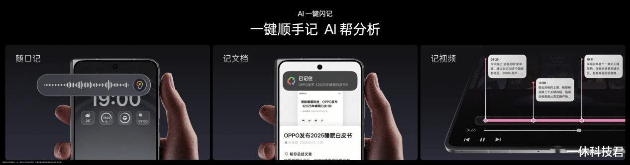依托强大的 AI 能力,OPPO Find N6 还首次搭载系统级多功能快捷键,带来「AI 一键闪记」功能,一键即可完成语音灵感记录、文档资讯摘要、视频关键信息提取;AI 录音功能可精准区分发言人,生成多模板智能会议纪要,真正实现「录音两小时,回顾五分钟」的高效体验。