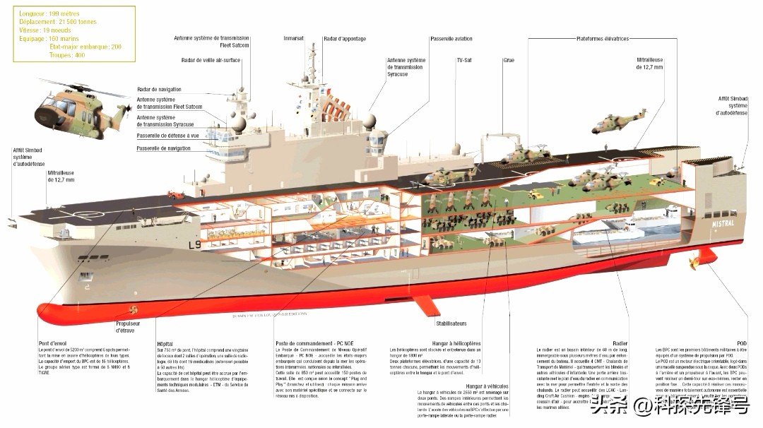 它的搭载能力堪称实用典范:6个直升机起降点,可混装16架NH90、虎式等直升机;坞舱容纳4艘快速两栖登陆艇或2艘气垫登陆艇;车辆舱极限可搭载40辆勒克莱尔坦克(实战部署中通常为混装模式,以兼顾兵力与装备的平衡),常规搭载约13辆坦克+60辆装甲车,标准搭载450名陆战队员,极限可投送900人。