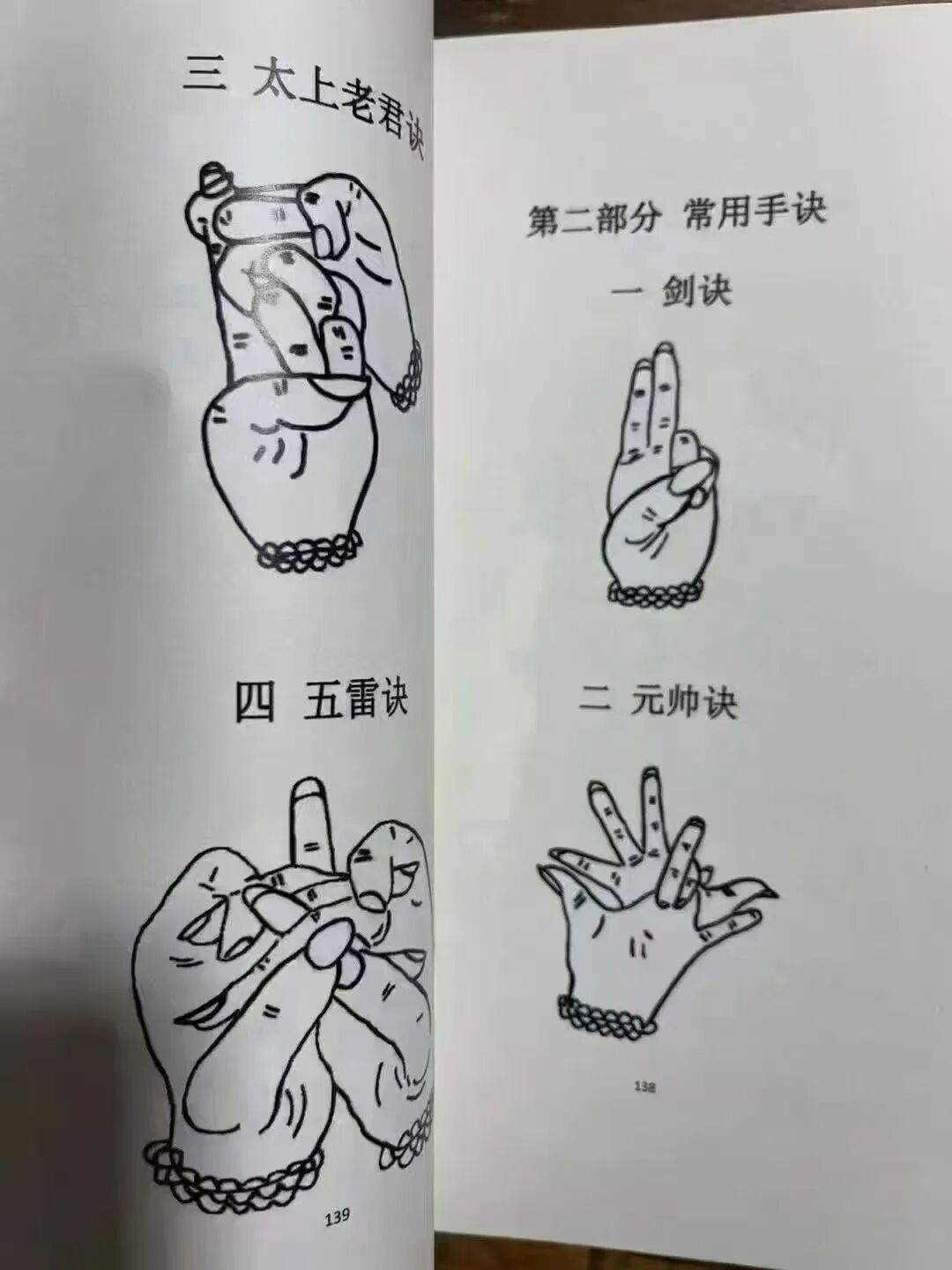 第二部分·常用手诀,系统收录各类风水核心手诀,涵盖剑诀、元帅诀、太上老君诀、鲁班仙师诀、九龙诀、福禄寿三星诀等,还有和合、刀山、天罗地网、降魔杵等专项手诀,详解每一个手诀的掐念方法、对应功效与使用场景,明确手诀与阴阳五行、天人相感的关联,教你通过掐诀结印,沟通天地、呼召正气、驱邪避凶,无论是风水实操、辟邪护佑,还是日常祈福,都能灵活运用。