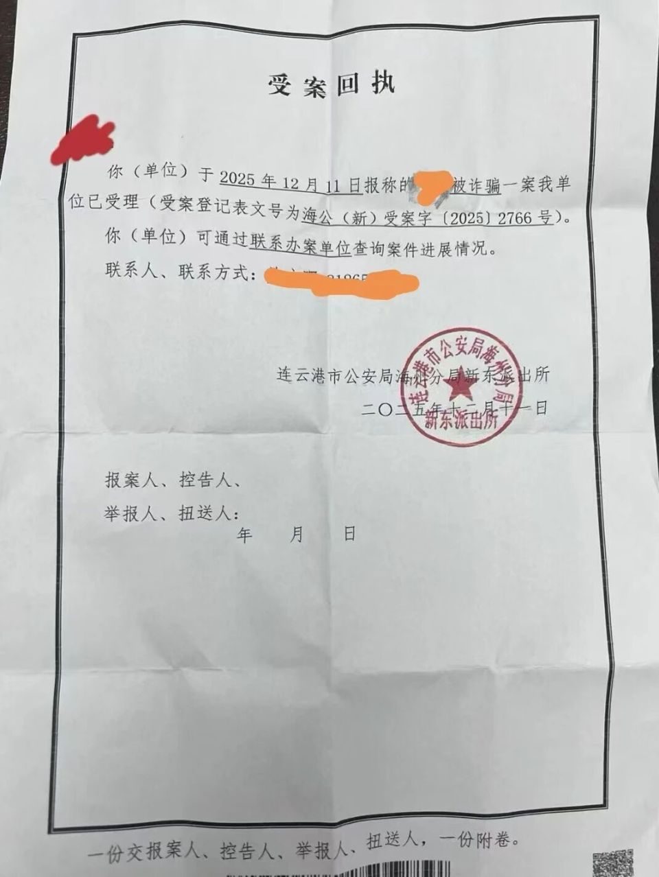 2025年12月11日,刘女士向当地警方报警,并收到了警方的《受案回执》。梁先生此时也将刘女士彻底拉黑。