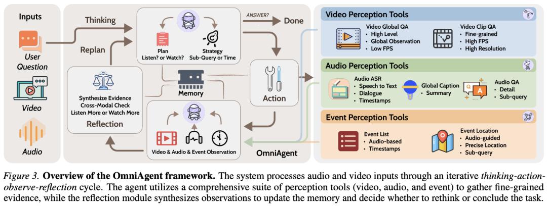 事件工具:利用音频能够高效捕捉全局上下文的特性,首创音频引导事件定位,快速锁定关键时间窗口,避免对长视频进行无效的视觉扫描 。 视频工具:包含粗粒度的全局视频问答,以及在特定时间内基于更高帧率进行分析的片段问答工具。 音频工具:涵盖音频全局描述、细粒度问答,以及支持精确时间戳的语音转录 (ASR)。3.观察与反思机制:智能体接受工具结果,评估目前已有的证据能否正确的回答问题,并且结合之前在多步推理中进行跨模态一致性检查,确保视听证据互证,解决幻觉与对齐问题。