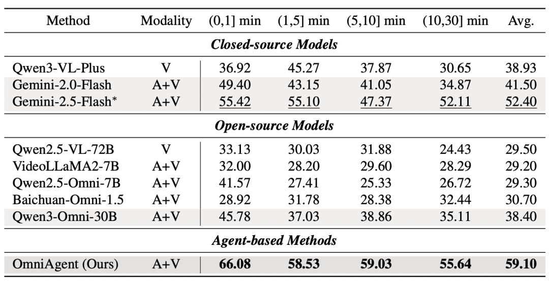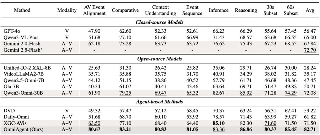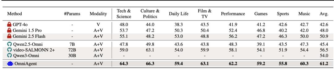 OmniAgent 在三个主流视听理解基准测试中均取得了 SOTA 成绩,显著优于现有的开源及闭源模型: