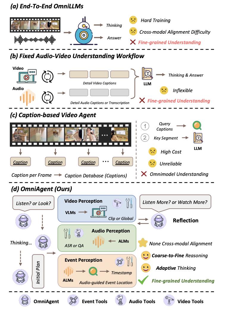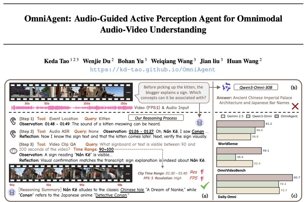 针对端到端全模态大模型(OmniLLMs)在跨模态对齐和细粒度理解上的痛点,浙江大学、西湖大学、蚂蚁集团联合提出 OmniAgent。这是一种基于「音频引导」的主动感知 Agent,通过「思考 - 行动 - 观察 - 反思」闭环,实现了从被动响应到主动探询的范式转变。